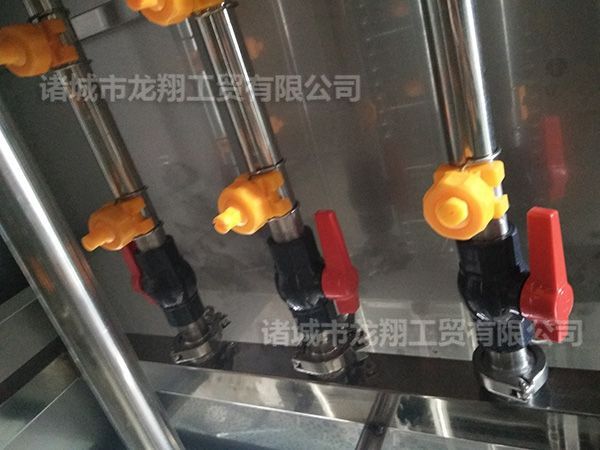 清洗分為三段一段為熱堿水,二段為熱清水,三段為自來水。三段噴淋水除第三段自來水外都有獨立循環過濾水箱,三段自來水作為補充水回收至二段水箱加熱使用過后部分污水被自動排出。二水箱內設有蒸汽加熱管,溫度從常溫至100°C自由設定、自動恒溫
